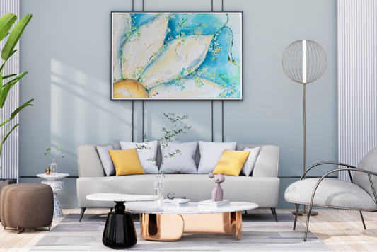A vibrant collection of modern semi-abstract originals on canvas from F.Claire’s Happy Art, designed to bring color, calm, and just the right amount of joy to your interiors. Each one-of-a-kind piece features calming blues, playful shapes, and touches of gold - like a deep breath, but for your walls.